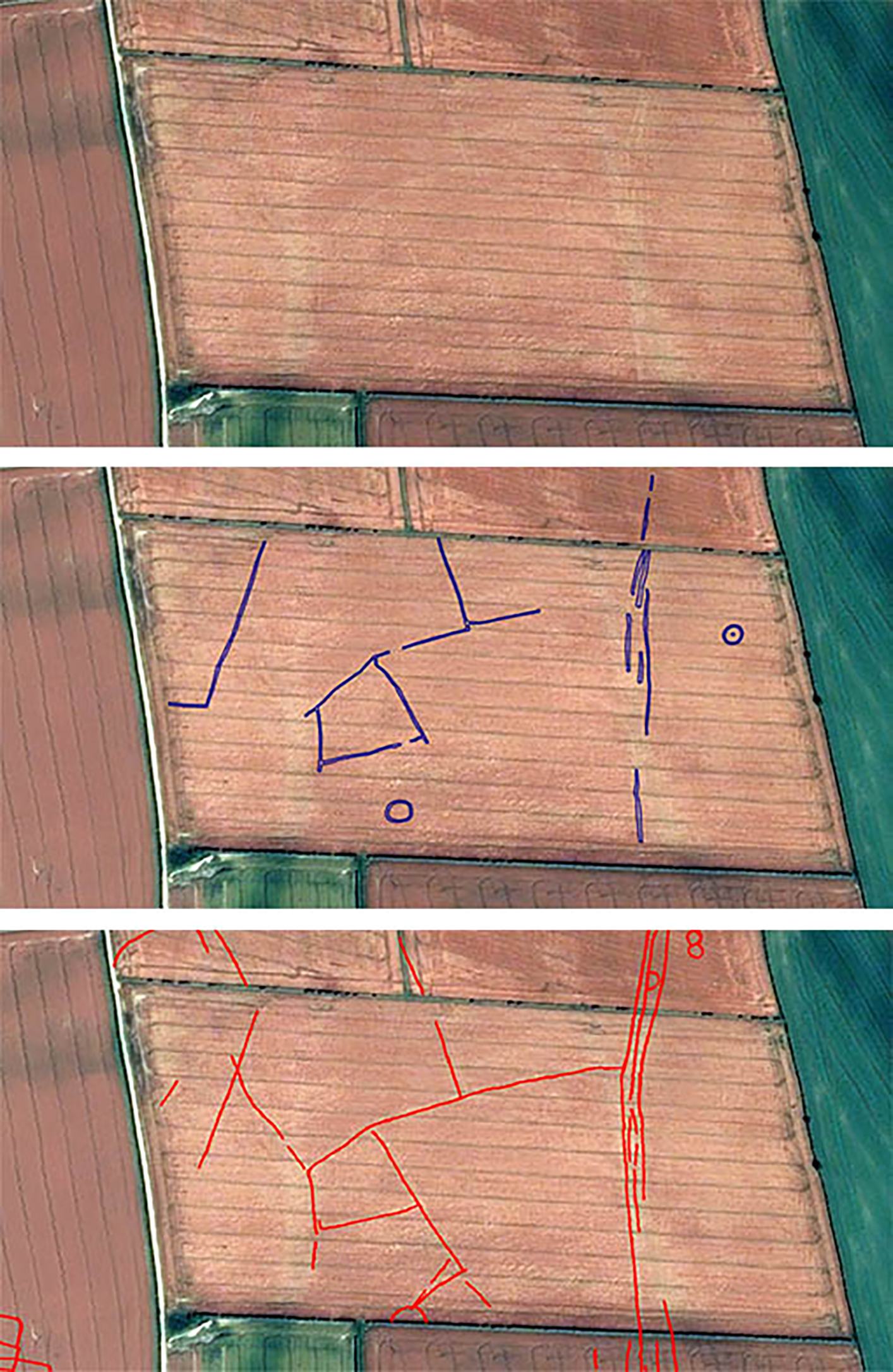 Figure 2: A series of images showing the original satellite image (top), the archaeology mapped from the image (centre) and the total of previously recorded archaeology using earlier aerial sources (bottom). Apart from the probable prehistoric enclosure (centre) there are traces of other related field boundaries and a possible trackway (right) © CNES (2024), Distribution Airbus DS