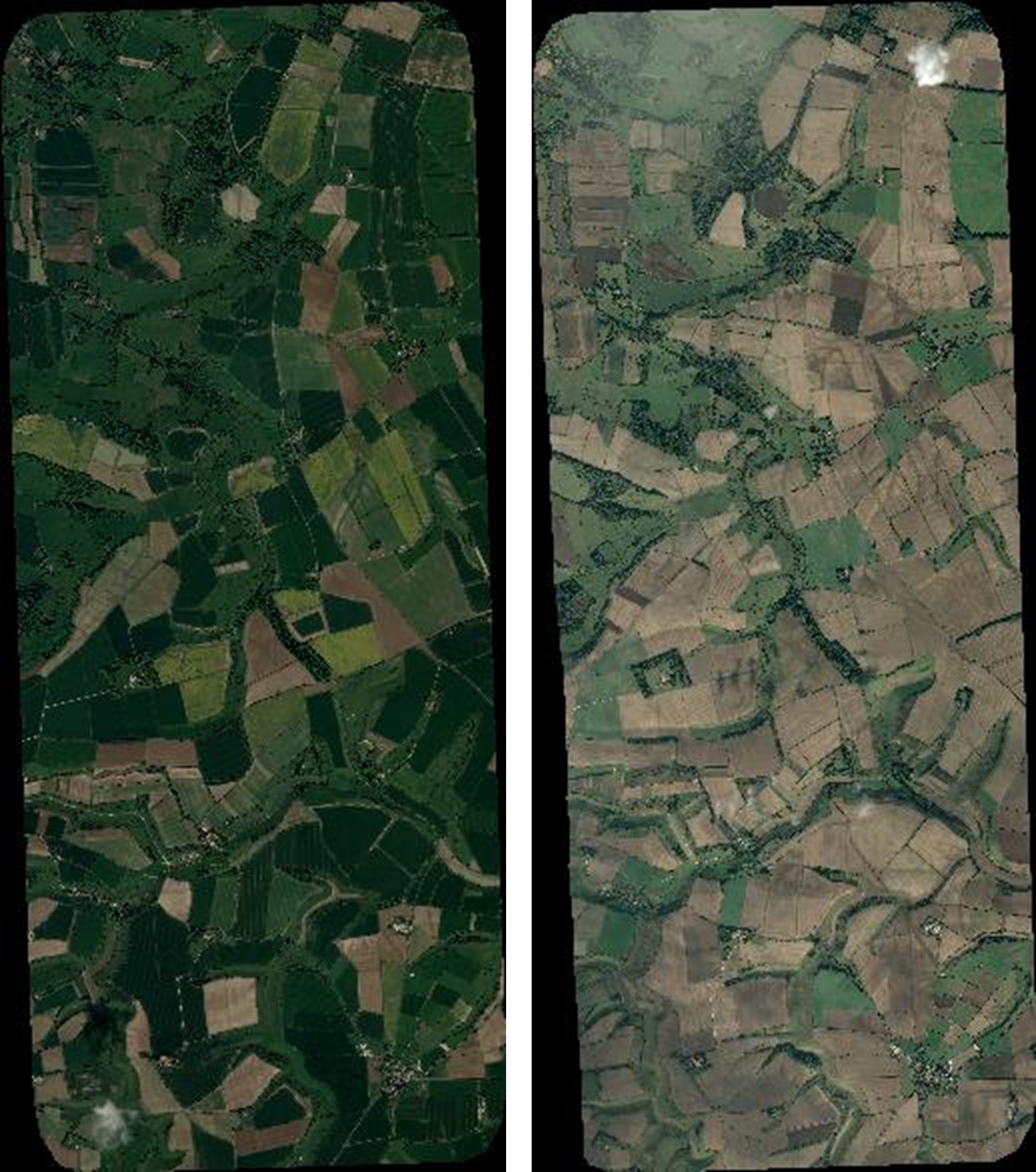 Figure 3: Yorkshire Wolds Archaeological Landscape project site, captured by Pleiades in May 2024 (left) and September 2024 (right). © CNES (2024), Distribution Airbus DS