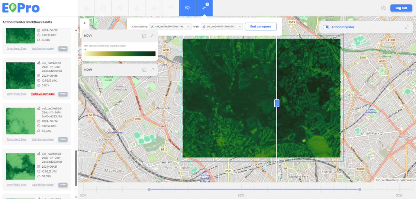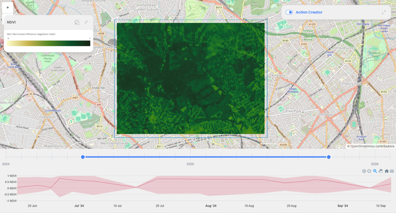 Another application on EODH is EOPro. The core feature of EOPro is the Action Creator, where users can create customised workflows for processing EO data. It outputs clear visuals and graphical results. London Boroughs highlighted how this type of application is useful for engaging with stakeholders. Accessibility of outputs is important for Local Authorities, as their stakeholders can be wide ranging. The visual nature of satellite imagery, and the hands-on nature of EODH’s applications, increases the accessibility of often complex technical challenges. The London Boroughs explored vegetation health, using Normalised Difference Vegetation Index (NDVI), for green infrastructure planning. There is potential to build on this analysis to inform urban greening projects.