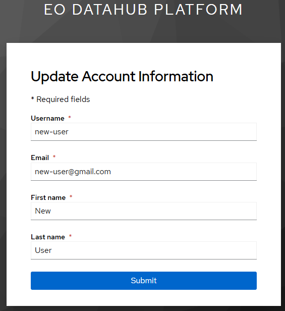 This will prompt you to input your chosen IdPs user credentials. Logging in for the first time will also prompt you to update account information, as shown below.