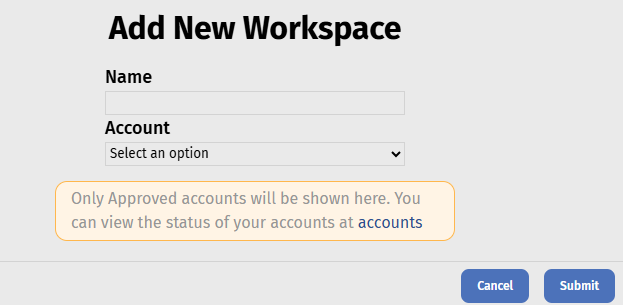 You must choose a name for the workspace. Workspace name can only include lowercase letters, numbers, and hyphens. It must start and end with a letter or a number. The account list shows which billing account you want to associate your workspace with. Only approved billing accounts will be able to have workspaces created.