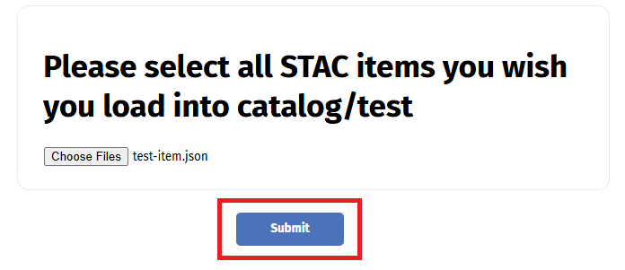 Now you are ready to upload your STAC Item metadata files. Select the Choose Files box and select any STAC Items you wish to upload to your selected Catalog and Collection.