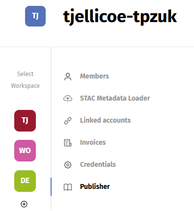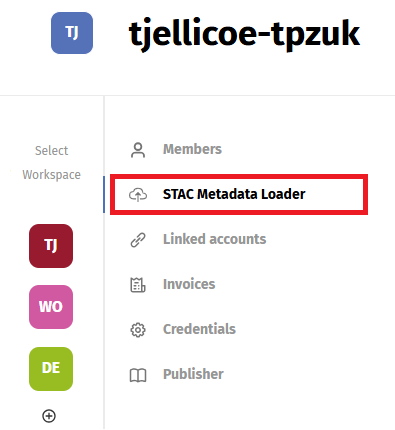 First navigate to the Workspaces page on the Hub, logging in if necessary, and select the workspace you wish to load data into from the icons on the left. Then select STAC Metadata Loader from the menu on the left side of the page.
