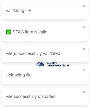 This will send your chosen Items for validation to ensure they are valid STAC JSON before you upload them to the Hub. Note, throughout the validation, uploading and loading steps process updates will be reported in the bottom left of the page to update you on the status of your loader.