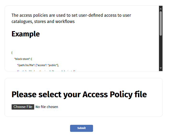 The Publisher allows you to configure the access policies by uploading a JSON file defining paths with associated access settings, as in the below example.