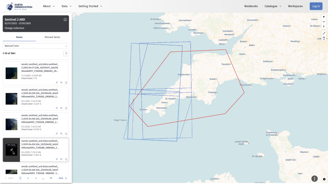 The most recent scenes appear first. Hover over items in the list to highlight corresponding areas on the map. Use the scroll bar or pagination controls to view more scenes. As you scroll, additional data will load on the map.